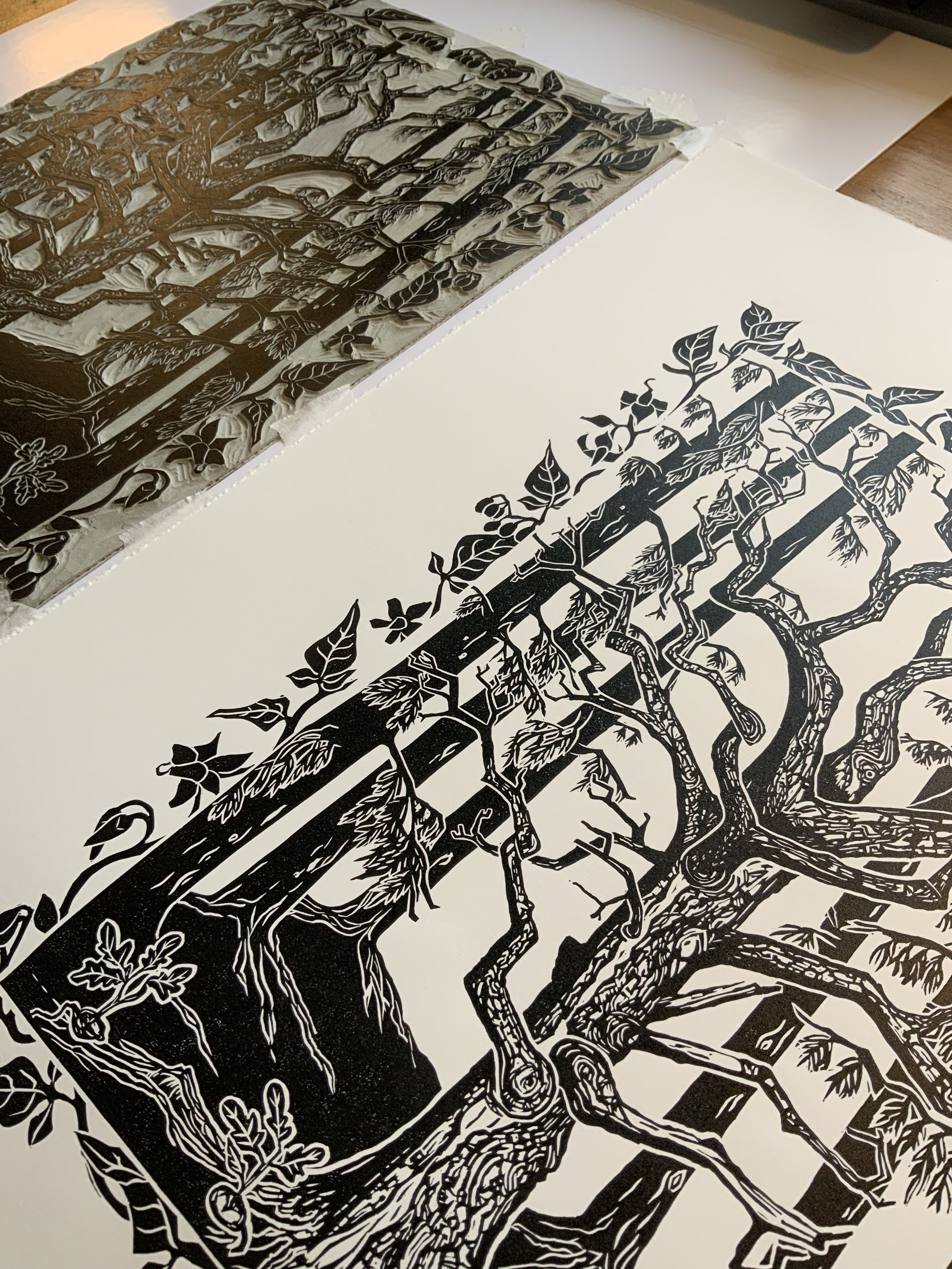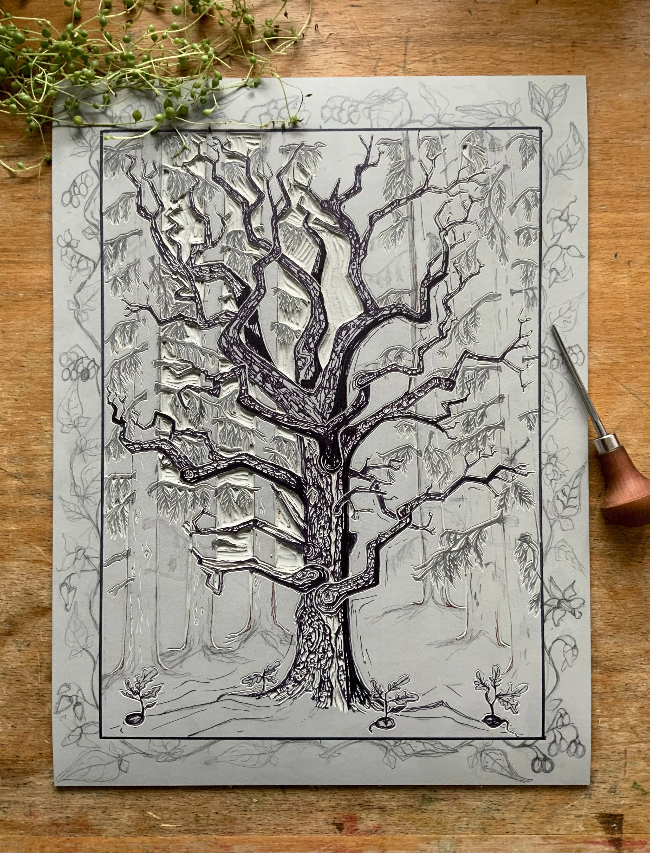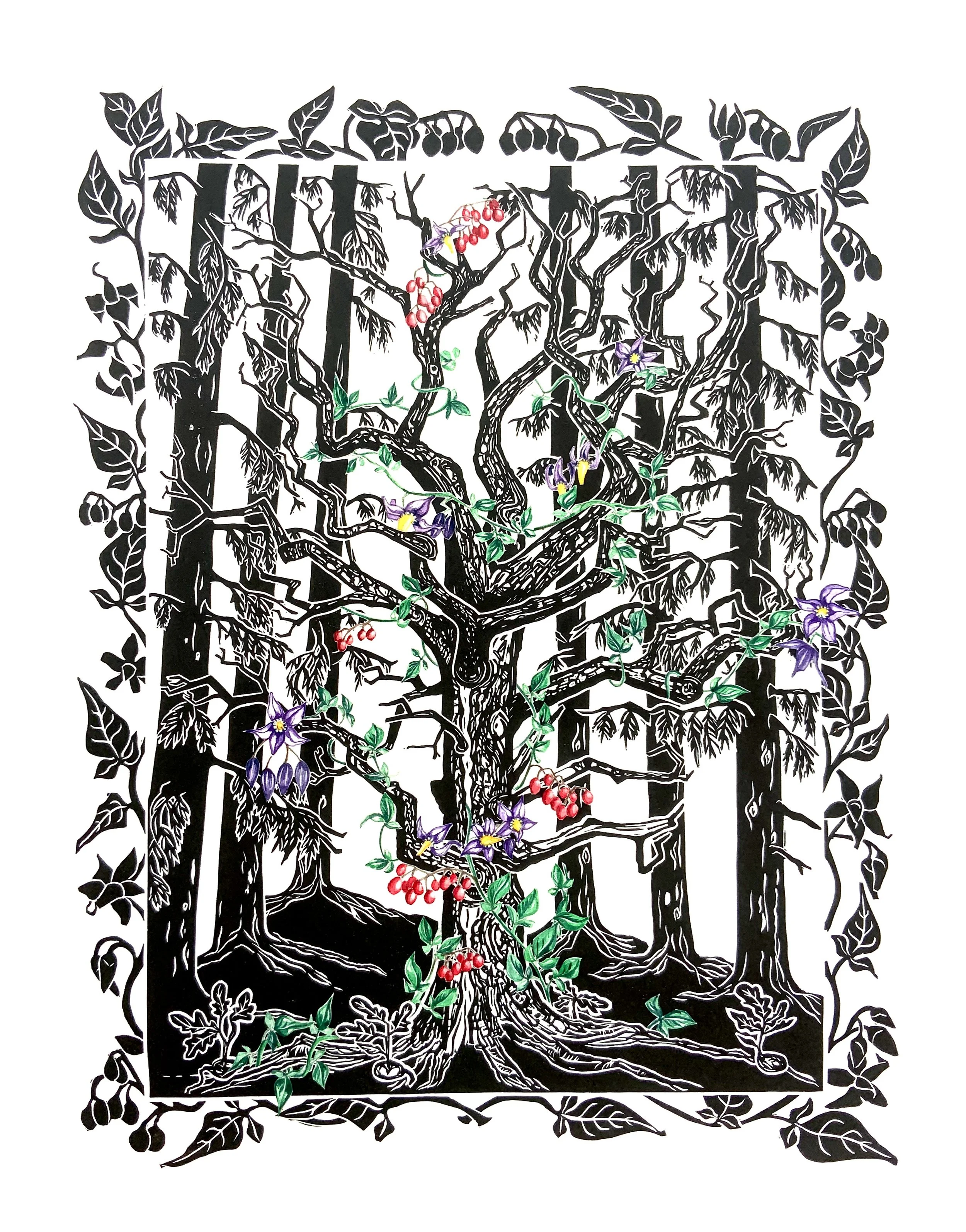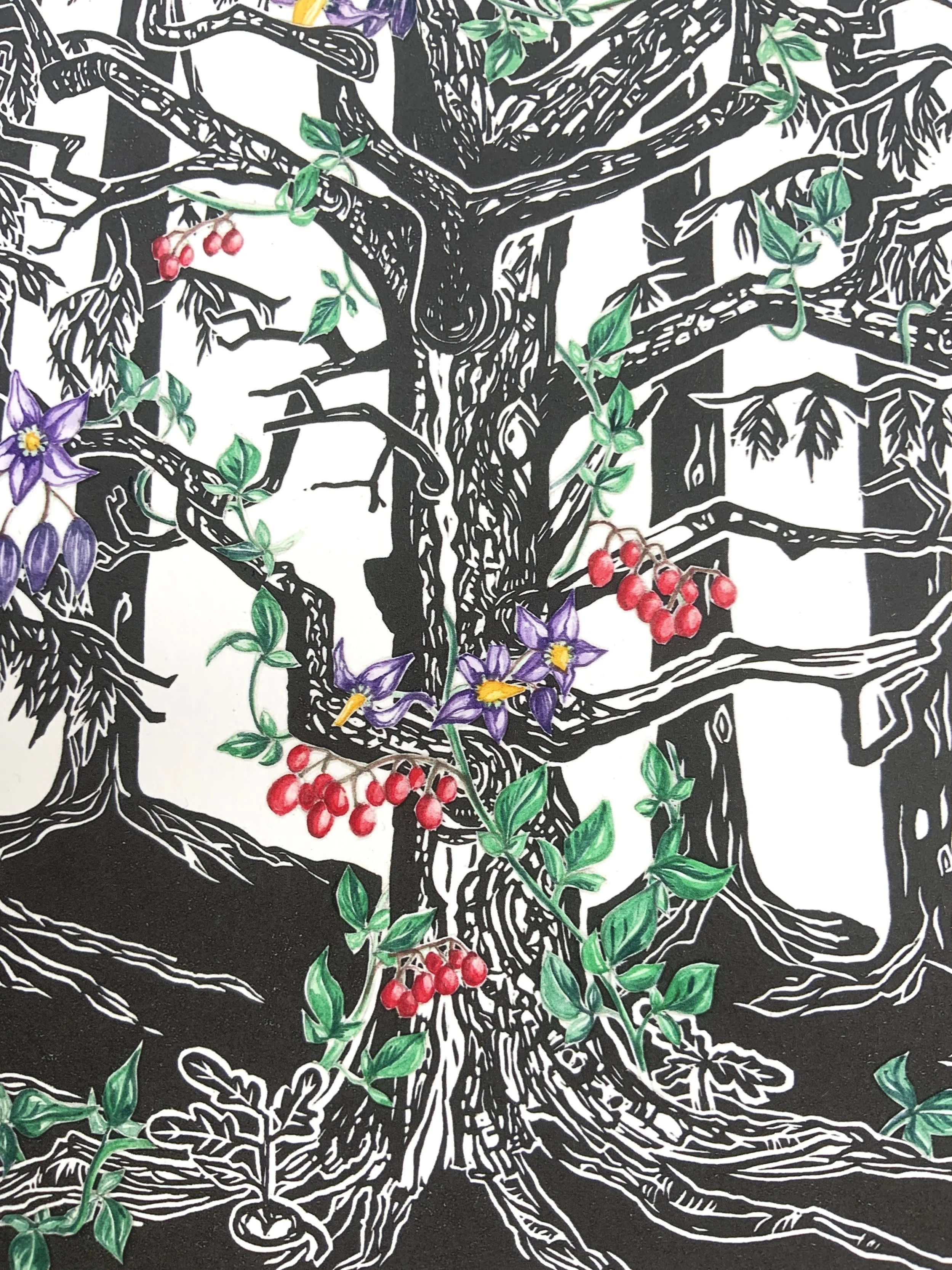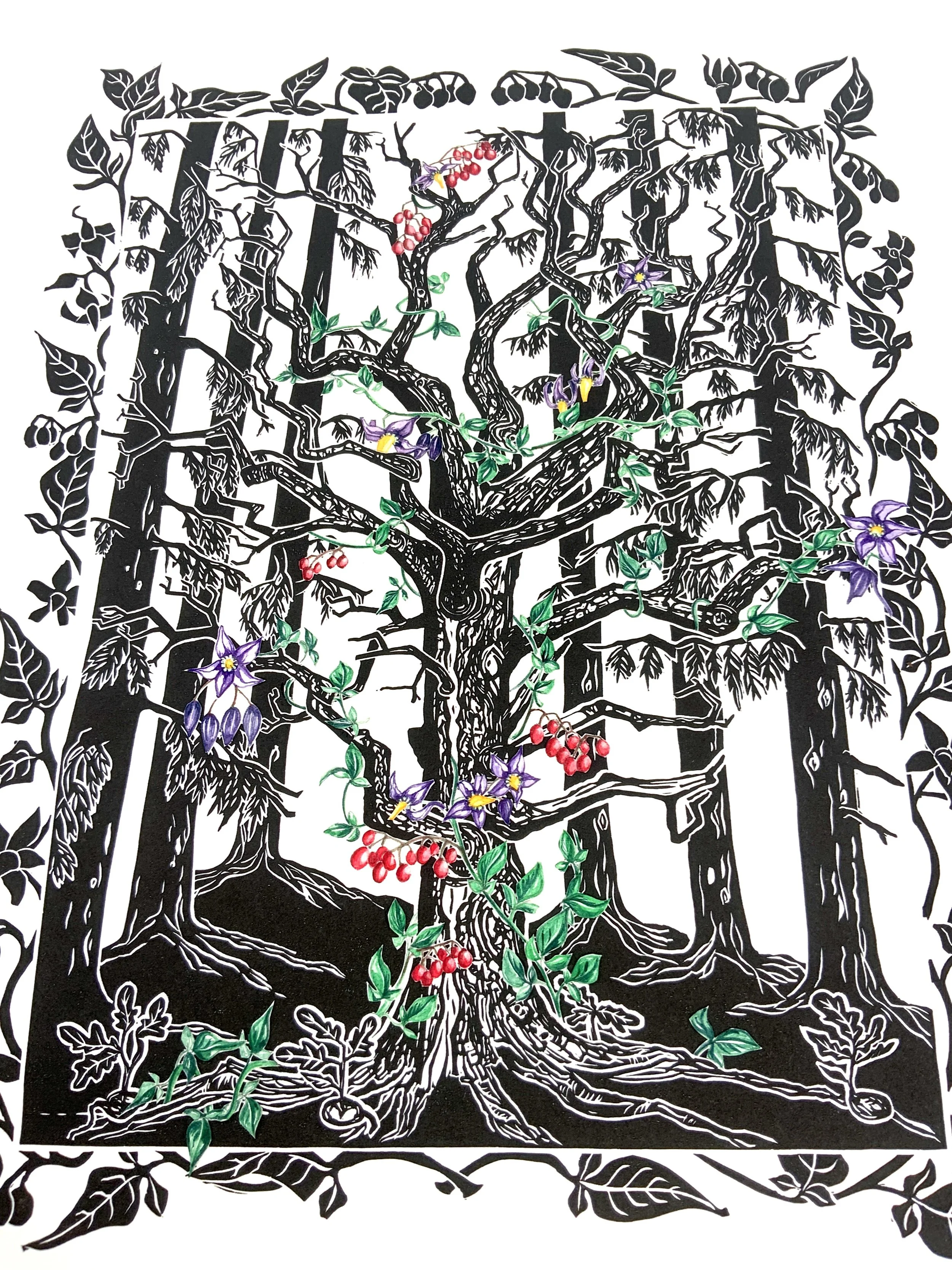 Years ago I came across this dead oak in the middle of patch of pine trees. The sunlight was shining right over the tree and it looked so magical. As I watched, I could see just how much life this dead oak was providing. Birds were living in it, plants were climbing up it and birds and insects were nibbling. It was very beautiful. I have depicted the Bittersweet or Woody Nightshade in watercolours which really draw the eye in to the beautiful shapes of the dead oak.